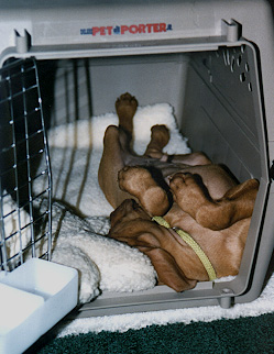 Karen trying to get Calvin out of his crate at the airport